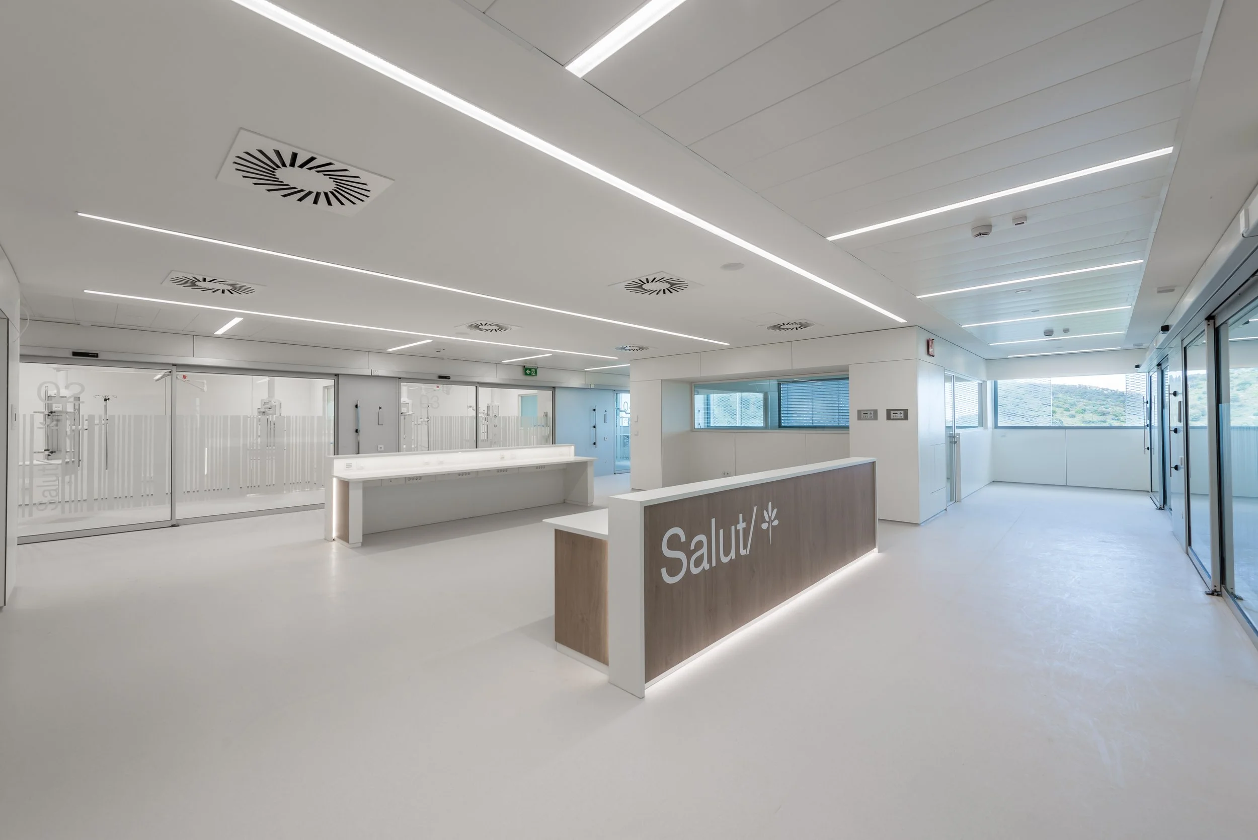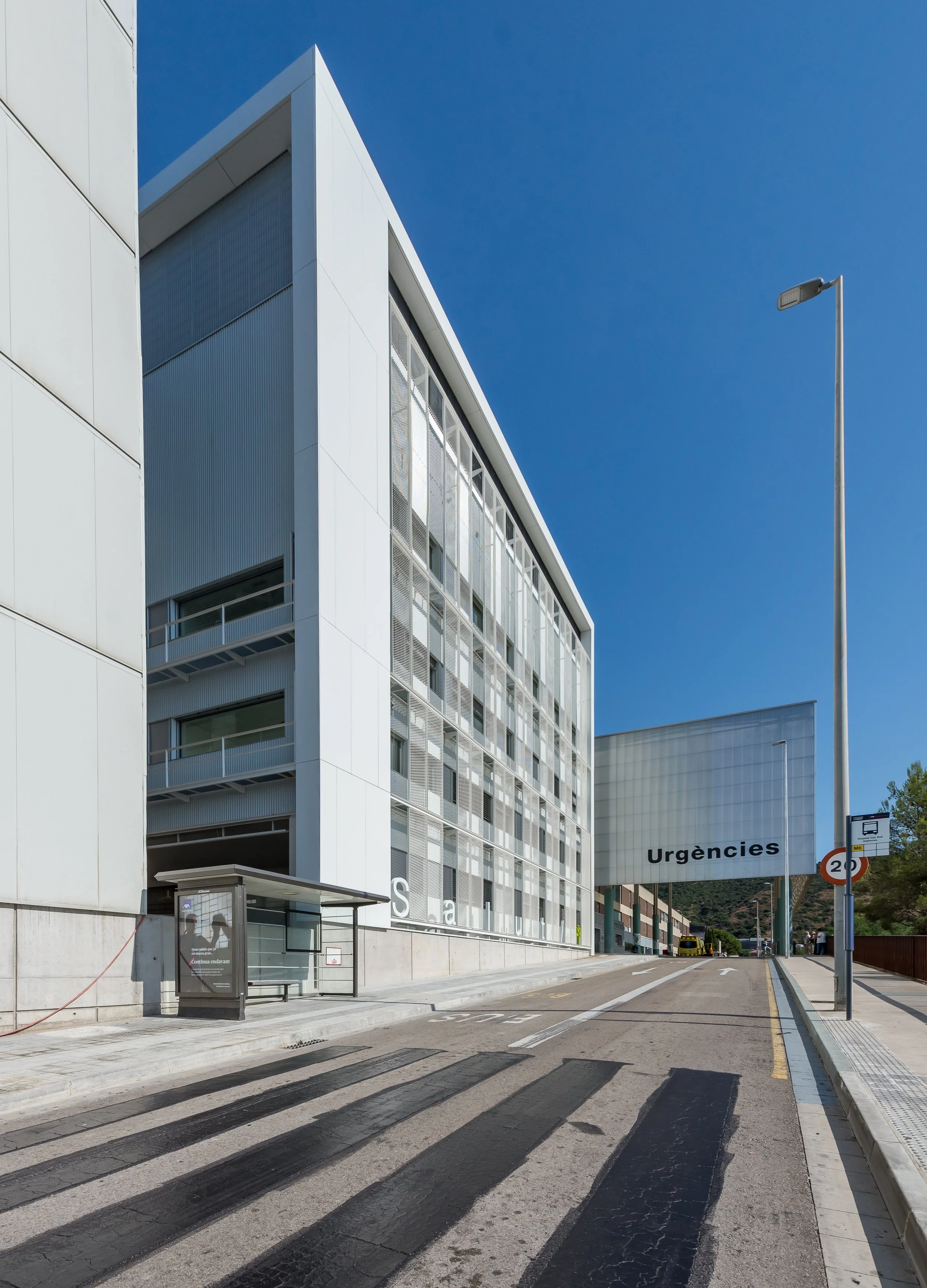 The project expands the surgical unit at Germans Trias i Pujol Hospital, located in Badalona at the foot of the Marina mountain range. Its complex site and the program's restrictions and requirements largely determined its configuration, which takes the form of a large cube emerging between the existing structures.