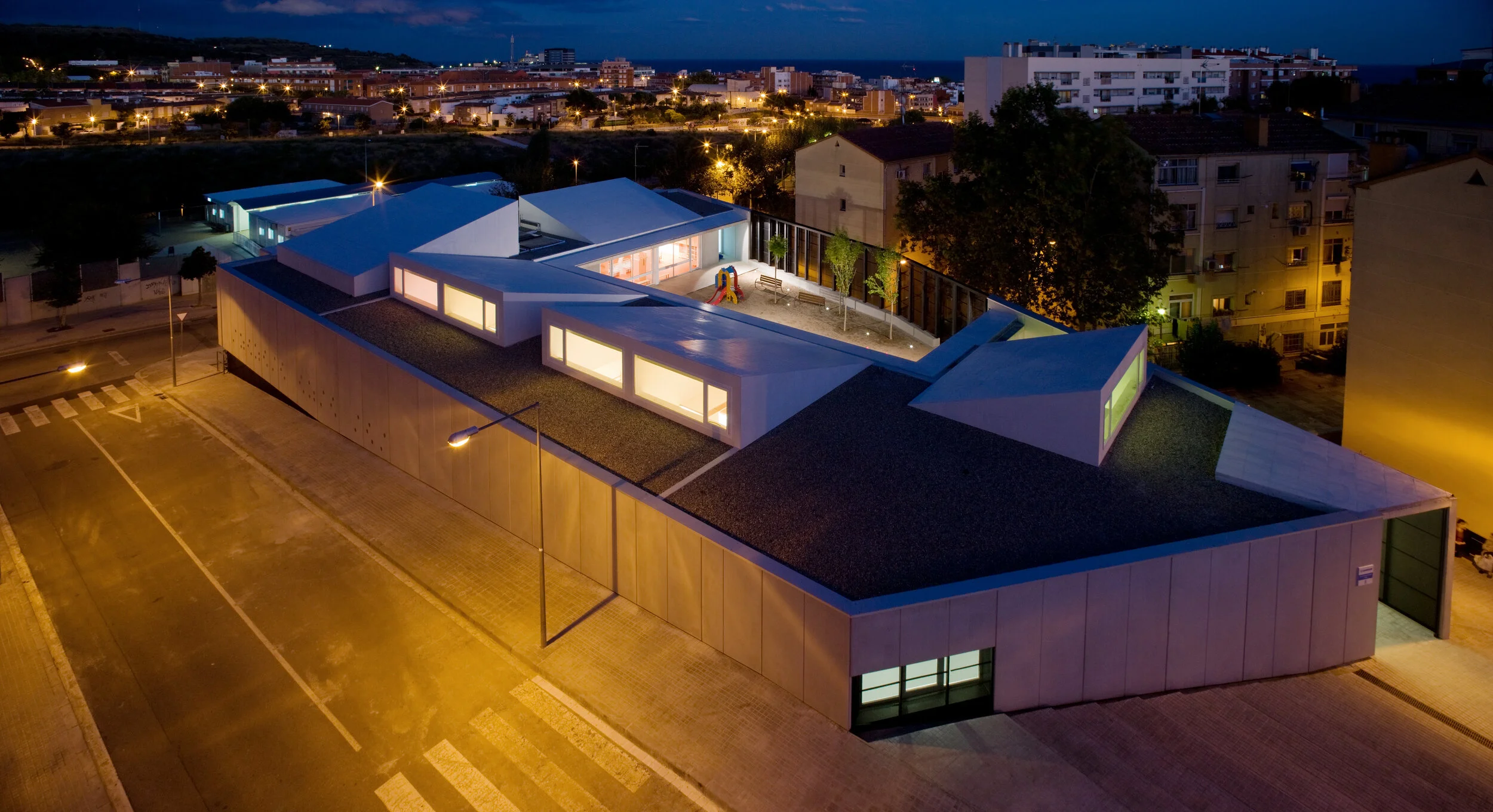 Five skylights flood the classrooms with natural light, and their double height provides a dynamic spatial experience for the children.